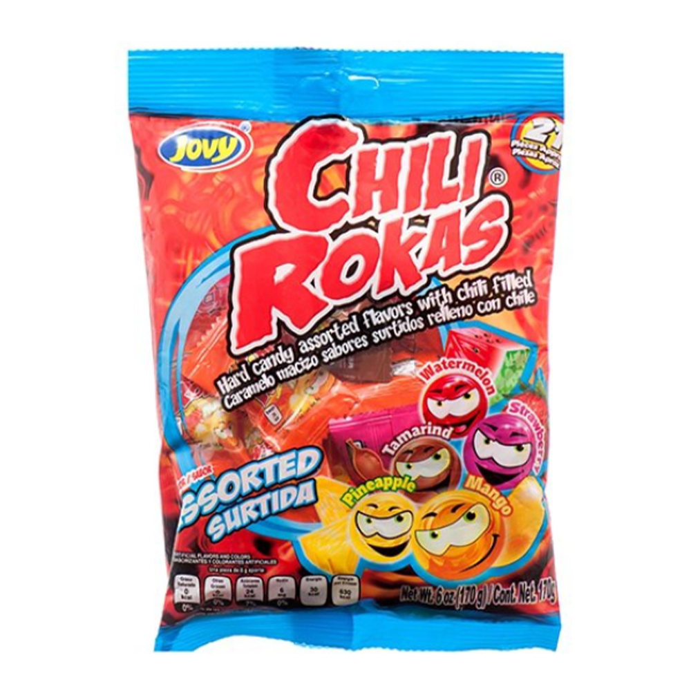 Jovys Chili Rokas - 5 flavors (Pineapple, Tamarind, Watermelon, Strawberry, Mango) a hard candy with a chili powder center! 21pc bag